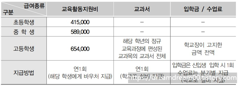 초등학생의 경우 415,000원, 중학생 589,000원, 고등학생 654,000원 연 1회 바우처 형식으로 지급이 됩니다. 고등학생의 경우 교과서대금 및 입학금 수업료도 실비만큼 지원(학교로 지원)이 됩니다.
