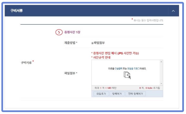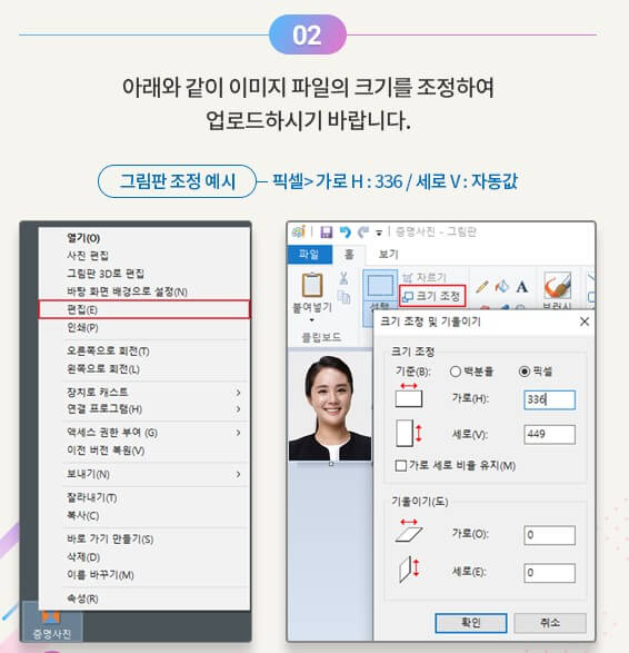 ✔️증명사진을 업로드합니다. 업로드하기 전 그림판에서 증명사진 크기를 조정 후 업로드 합니다. 크기는 픽셀 가로 : 336, 세로 : 자동값으로 하며 JPG형식의 사진만 등록할 수 있습니다.