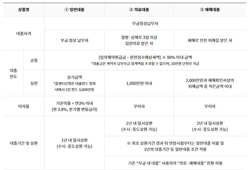 공제금을 밀리지 않고 잘 납부한 가입자는 해약환급금 90% 범위에서 대출기간 1년(연장가능), 이자 3.8%(23.5월 기준)로 돈을 빌릴 수 있습니다. 이때 의료 관련 (1천만 원 이내), 재해 관련 (2천만 원 이내) 돈을 빌릴 수 있으며 이 경우 이자는 없습니다.