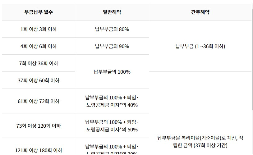 만약 개인 사정으로 공제 해지를 원하는 경우에는 그동안 받아온 소득공제를 기타 소득으로 잡아 종합소득세가 원천징수되어 원금 손실이 발생합니다. 일반해약의 경우 3년 이상 납부해야 납부금의 100%를 지급받을 수 있으나 이때 소득세(기타 소득세=기타 소득금액 X법정세율)가 원천징수됩니다.