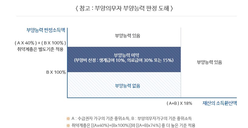📌부양능력 없음 : 부양의무자 판정소득액이 B의 100% 미만, 재산 소득환산액이 A와 B 합의 18% 미만인 경우