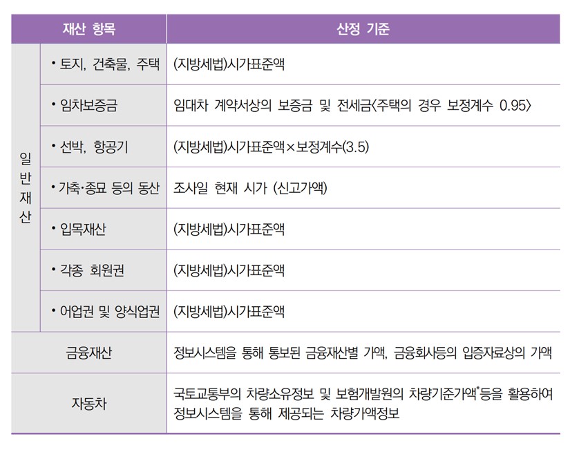 재산에는 건축물, 토지, 주택, 분양권, 가축, 회원권, 금융재산, 자가용 등이 포함되며 산정기준은 아래 표와 같습니다.