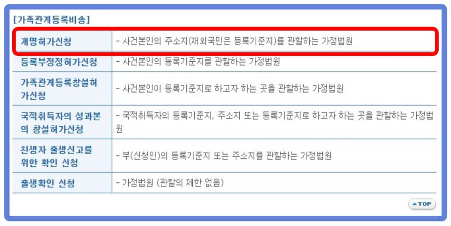 🌟개명허가신청의 경우 사건본인의 주소지를 관할하는 가정법원을 선택해야 합니다.