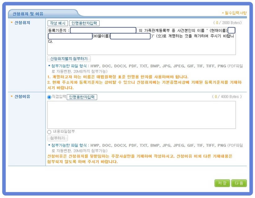 11. 신청취지는 자동으로 입력이 되며 신청이유를 작성합니다. 신청이유는 대표적으로 많이 쓰시는 것이 본 이름의 뜻이 좋지 않다거나, 어려운 발음을 가져 생활에 불편함이 있다는 등 실제 본인이 이름을 통해 겪었던 불편사례를 작성하시면 됩니다. 만약 작명소에서 개명을 하신 경우 보통 작명소에서 이유서까지 작성해 주시니 그 내용을 그대로 쓰시면 됩니다.