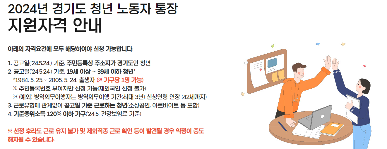 경기도 청년 노동자 통장을 신청하기 위해서는 4가지 조건을 충족해야합니다.