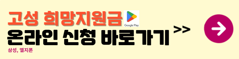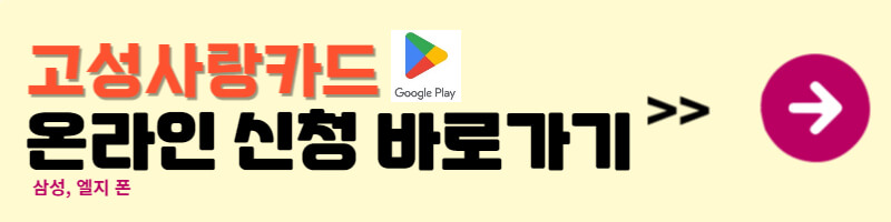 ➡️희망지원금 온라인 신청은 고성사랑카드(그리고카드)를 소지한 분만 신청할 수 있습니다. 아래링크를 통해 카드를 미리 신청하시고 신속하게 온라인으로 지원금 받으시기 바랍니다.