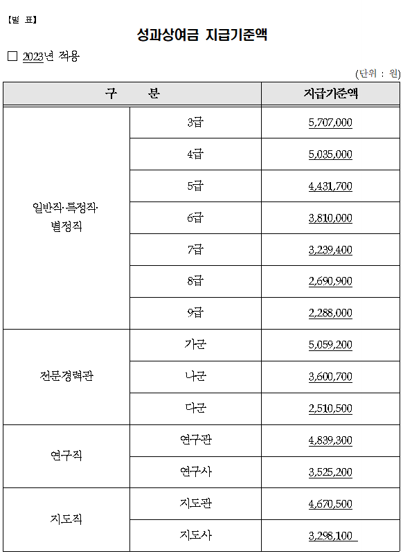 공무원 성과상여금 지급기준액을 살펴보면 2023년 기준 일반직 9급 공무원 2,288,000원, 8급 공무원 2,690,900원, 7급공무원 3,239,400원 입니다.