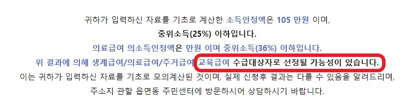 교육급여를 받기위해서는 신청가구원의 소득과 재산만을 확인하고 있습니다. 소득 및 재산이 중위소득(소득이 정액이) 50% 이하인 가정에 초·중·고등학생의 자녀가 있다면 교육급여 바우처 지원이 가능합니다.