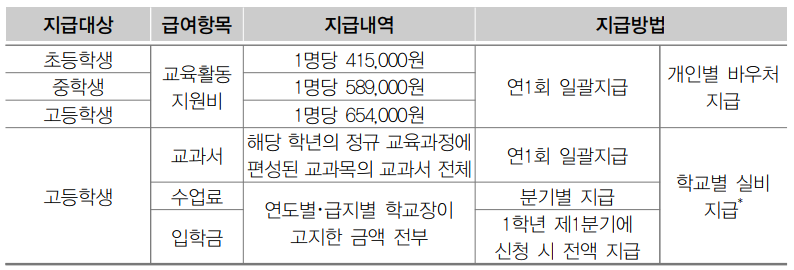 초등학생의 경우 415,000원, 중학생 589,000원, 고등학생 654,000원의 교육활동지원비를 받을 수 있습니다. 이 금액은 연 1회 일괄로 지급되는 것이며, 개인별 바우처로 지급하고 있습니다. 개인 바우처로 지급받기에 바우처 신청을 또 해야 합니다.