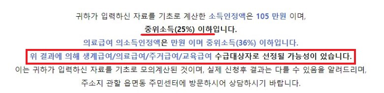 모의계산기 이용 시 위와 같은 결과를 얻어 대략적인 수급자 가능여부를 알 수 있습니다. 어디까지나 모의계산이기 때문에 주민센터에 방문해 상담을 받는 것이 가장 중요합니다.