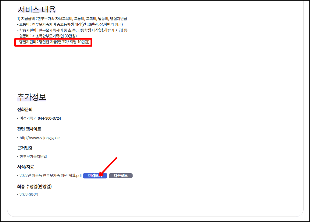 ⑤ 계획서 내에서도 세종시에서 저소득 한부모 가족 세대에 명절지원금 연 20만원 지원되는 내용을 확인 할 수 있습니다.