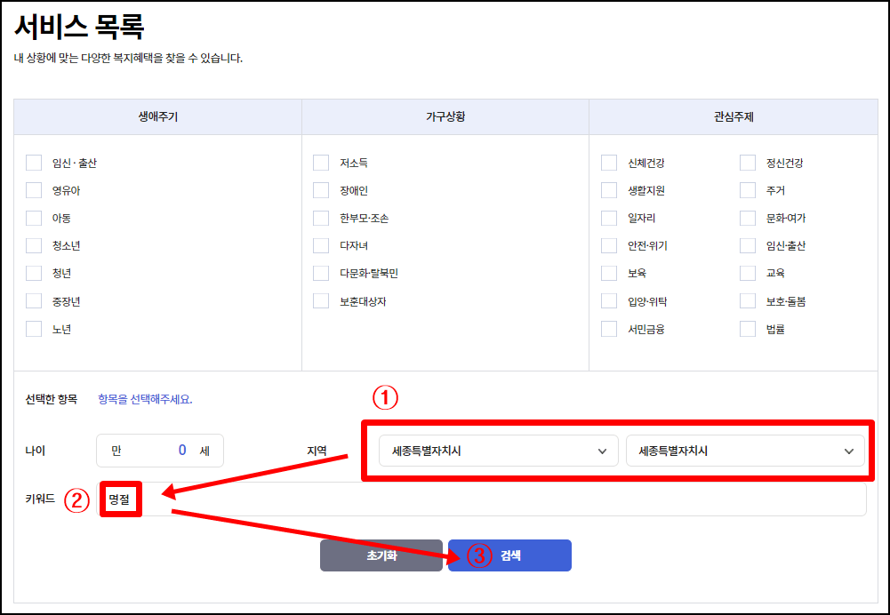 1. 위의 버튼을 통해 복지로 서비스 목록 페이지로 이동합니다. ①지역을 본인이 거주하는 곳을 선택합니다. ②키워드에 "명절"이라고 입력합니다. ③"검색"을 클릭합니다.