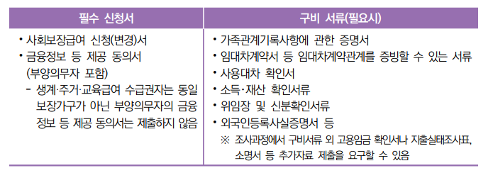 그 외에 제출서류로는 가족관계증명서, 임대차계약서 등 이 필요합니다. 가족구성원에 따라, 가구의 사정에 따라 정확한 제출서류가 정해집니다. 따라서 주민센터에 전화상담 또는 방문상담을 받으신 후에 필요서류를 최종 제출하시는 것이 가장 좋습니다.