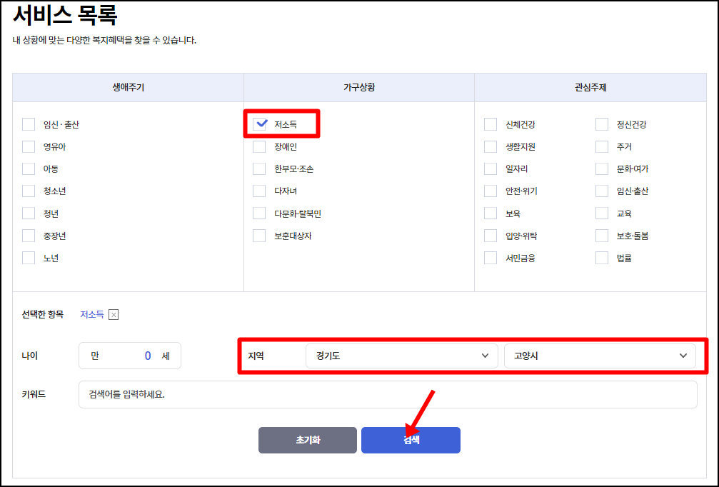 2. 가구상황을 저소득에 체크 후 지역을 내가 살고있는 지역으로 지정 후 검색을 클릭합니다.