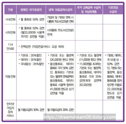 🔸통신요금 감면 : 생계, 의료, 주거, 교육