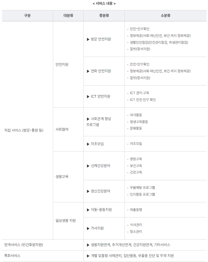 - 안전지원 : 전화 및 방문 안전확인, 재난/ 안전/ 보건 정보제공, 말벗 서비스
