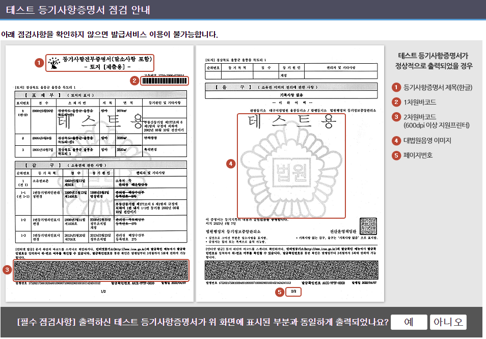 10. 출력된 테스트용 등기부등본의 정상적으로 출력되었는지 확인합니다.