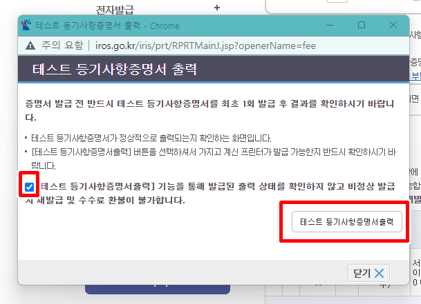 9. 출력하려는 프린트기를 테스트해야지만 진짜 출력을 할 수 있습니다. 해당 내용에 체크 후 테스트 등기사항증명서 출력을 클릭합니다.