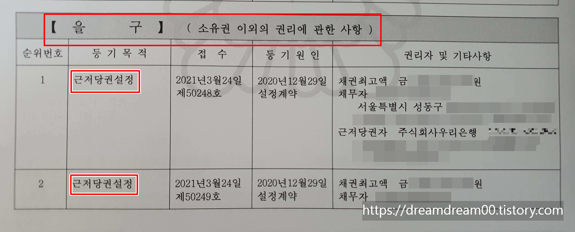 등기부등본의 을구는 소유권 외의 권리인 저당권, 전세권, 지역권, 지상권 등의 권리와 계약하고자 하는 부동산의 저당권 또는 근저당권이 설정되어 있다면 저당권이 말소되었는지 여부를 확인할 수 있습니다.