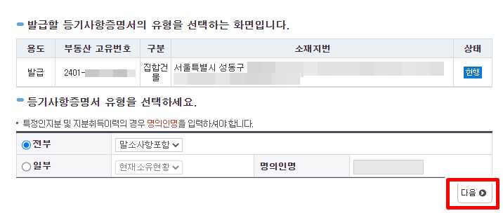 6. 등기사항증명서 유형을 선택 후 다음을 클릭합니다. 등기사항증명서 유형 선택 시 아래사항을 참고하시기 바랍니다.