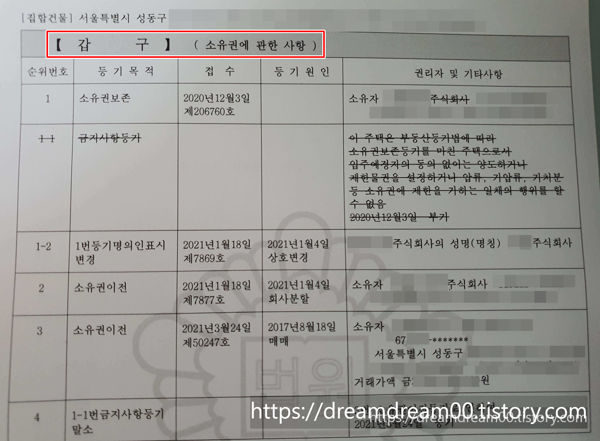 또한, 갑구 마지막 부분에 나오는 집주인의 주소가 실제 집주인의 신분증 주소와 일치하는지 여부도 확인하는 것이 좋습니다.
