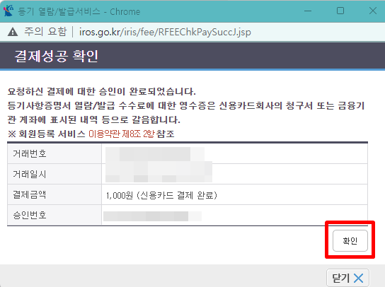 13. 결제가 완료되면 결제성공 팝업이 나옵니다. 확인을 클릭합니다.