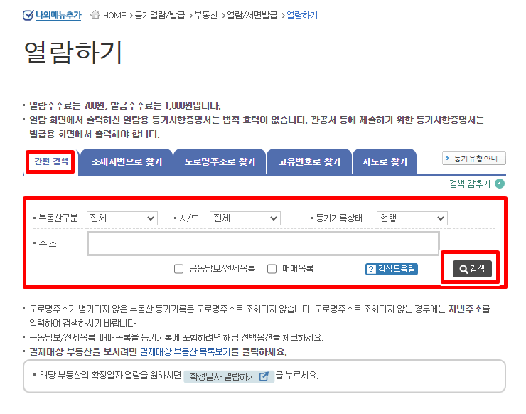 3. 열람을 원하는 곳의 부동산구분, 시/도, 등기기록상태, 주소를 입력합니다. 이때 도로명 주소가 검색되지 않는다면 지번주소로 검색을 합니다. 간편 주소로 입력할 때에는 다음사항을 참고하시기 바랍니다.