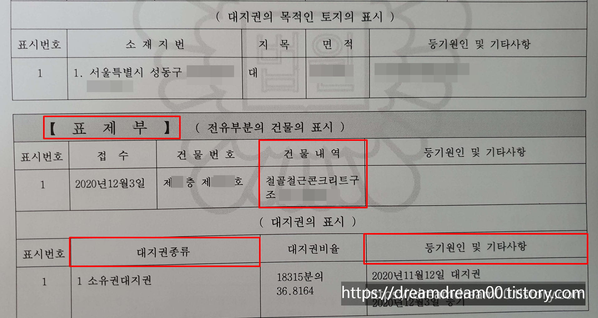 | 표제부 | 건물의 표시, 지번, 명칭, 건물내역 사항으로 계약서상 주소와 실제 거주할 예정인 주소 일치여부 확인 |