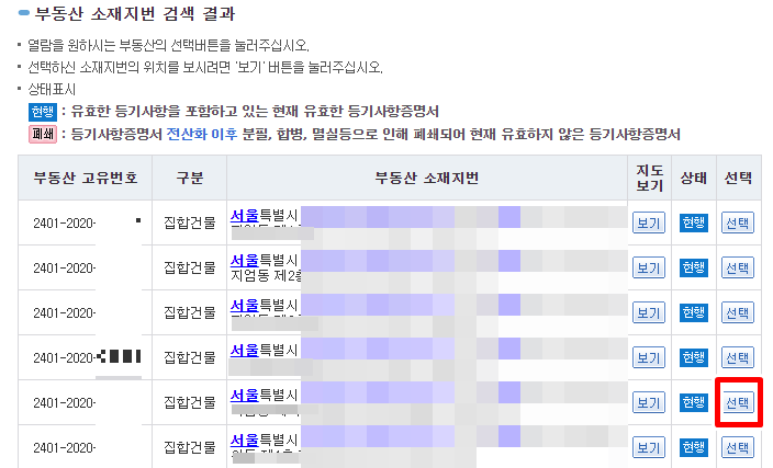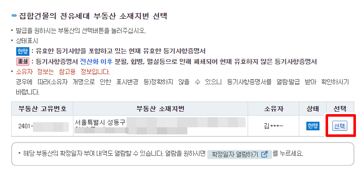 4. 출력하려는 건물 또는 토지의 선택을 클릭합니다.