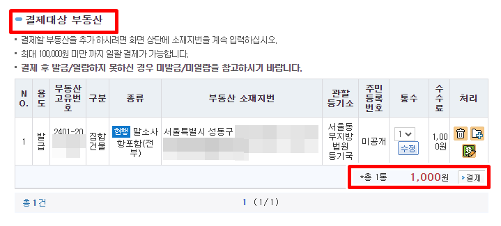 8. 결제대상 부동산 내용을 확인 후 결제를 클릭합니다. 등기부등본 출력 수수료는 1통당 1,000원입니다.