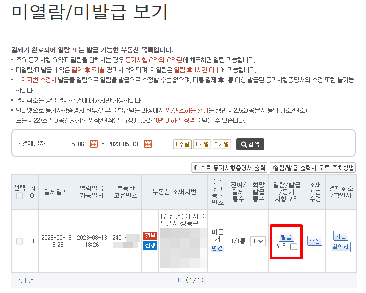 14. 마지막으로 해당 건물에 발급을 클릭하면 출력이 완료됩니다.