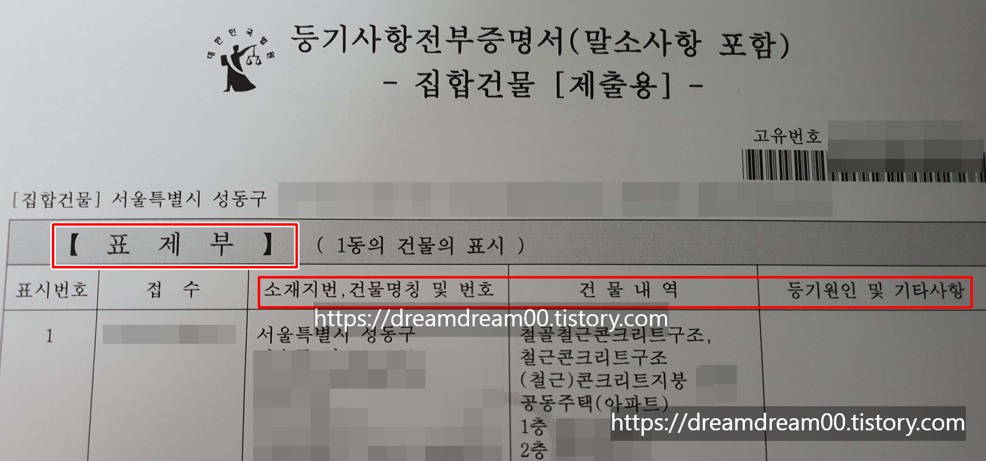 | 표제부 | 건물의 표시, 지번, 명칭, 건물내역 사항으로 계약서상 주소와 실제 거주할 예정인 주소 일치여부 확인 |