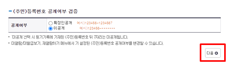 7. 주민등록번호 공개여부(보통 미공개)를 선택한 후 다음을 클릭합니다. 특정인 공개의 경우 특정인의 주민등록번호를 13자리를 전산에 입력해야지만 공개하여 발급이 가능합니다.