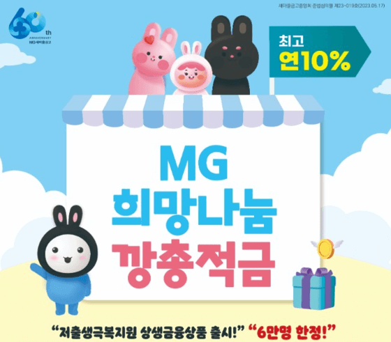 새마을금고에서는 60주년을 맞이해 저출산 극복을 위해 공익적인 목적으로 연 10%의 금리가 제공되는 깡총적금을 선보였는데요. 2023년 생 토끼띠 아기라면 가입이 가능합니다. 그리고 1인 1 계좌만 가입할 수 있습니다.
