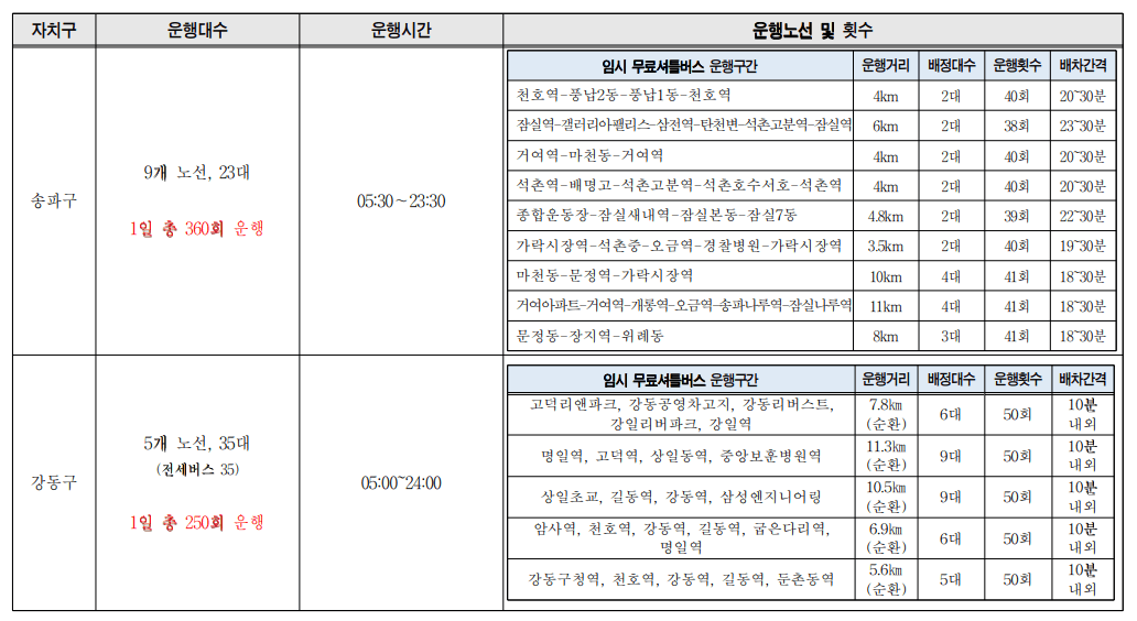 자치구별 무료 셔틀버스는 아래와 같습니다.