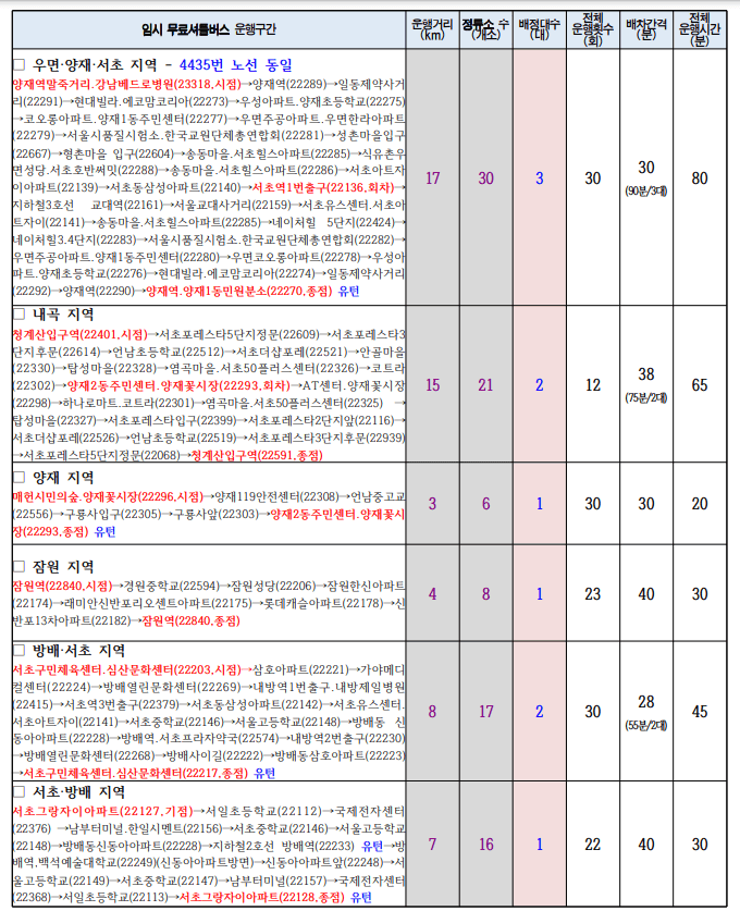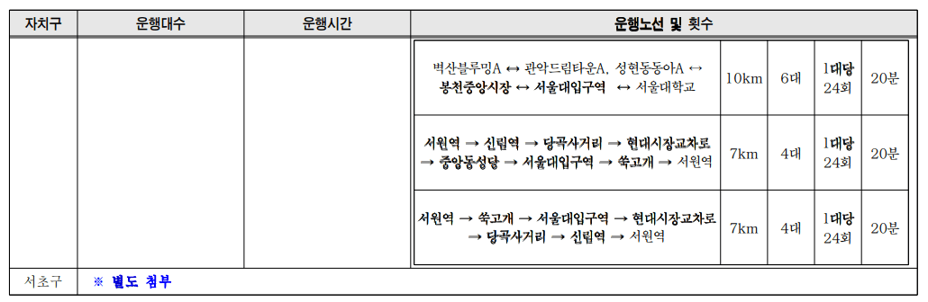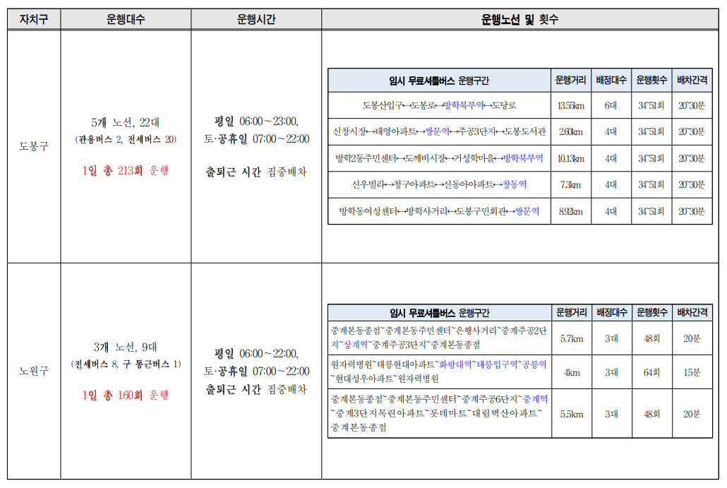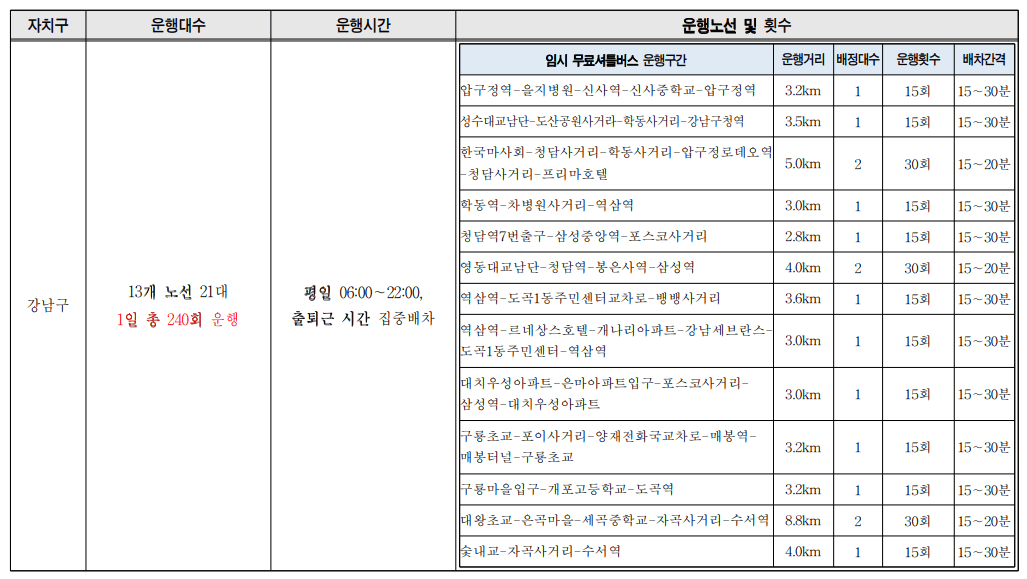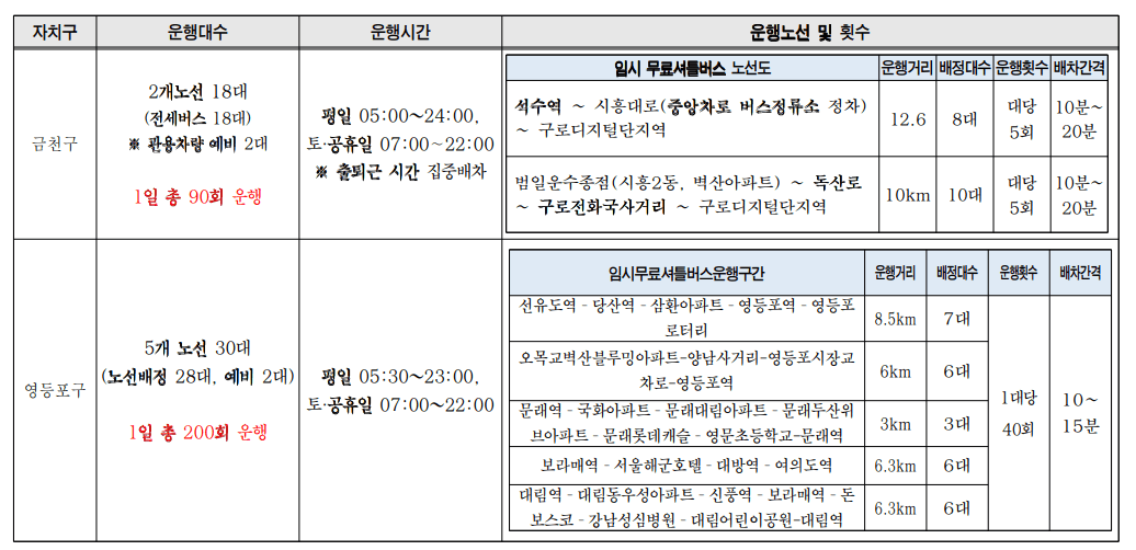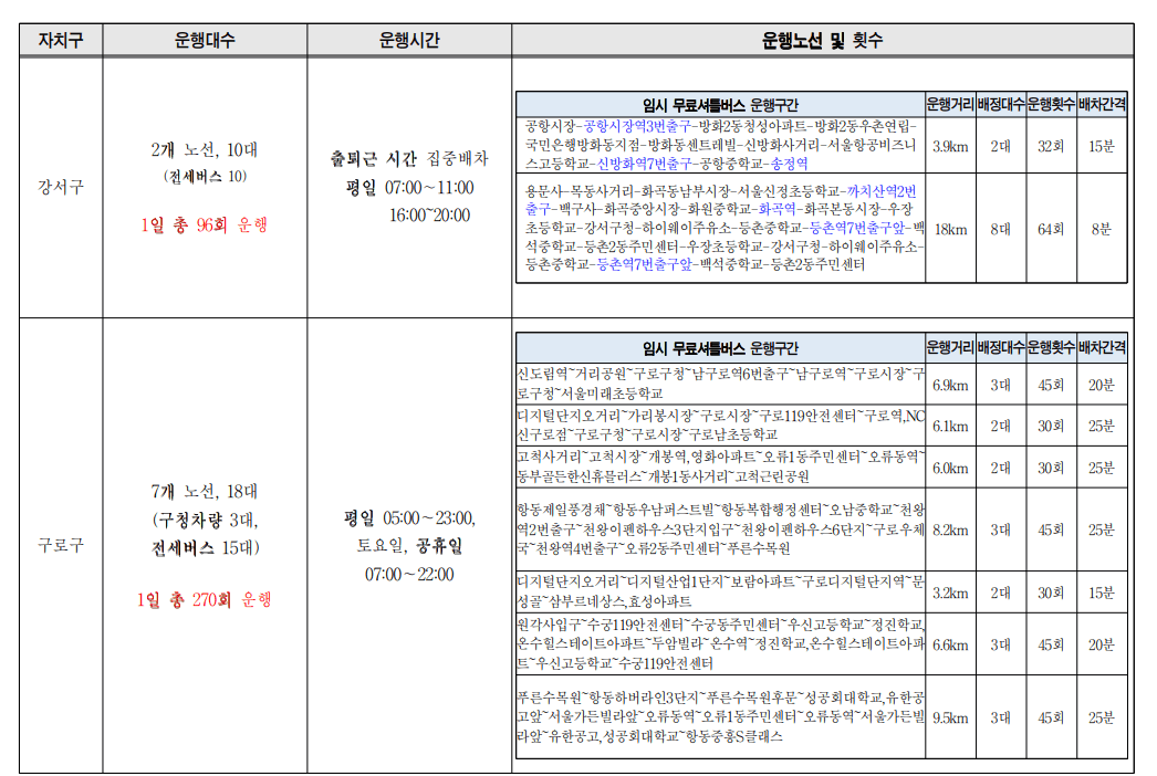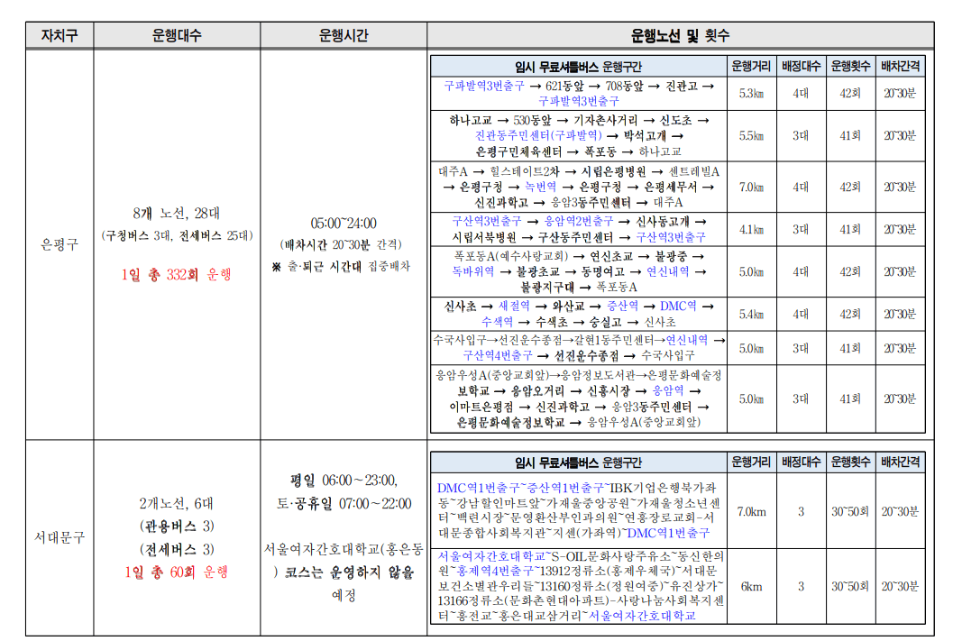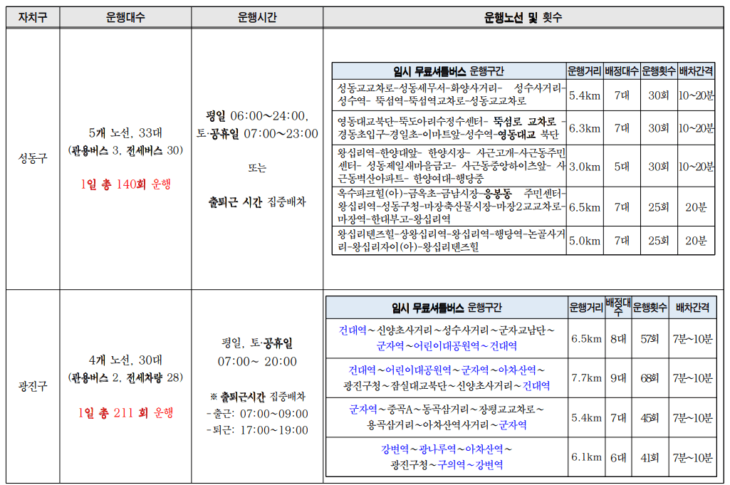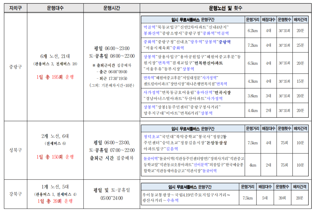 자치구별 무료 셔틀버스는 아래와 같습니다.
