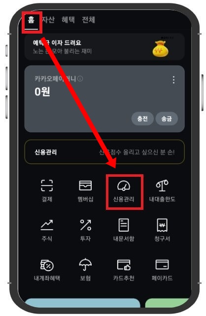 4. 홈 화면에서 신용관리 메뉴를 클릭합니다.