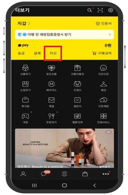 3. 카카오페이 노란색에서 자산을 클릭합니다.