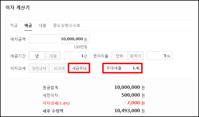 금리가 5%인 1년 만기인 세금우대상품에 1천만원을 예금한 경우 만기 시 최종받는 이자는 493,000원이 됩니다. 세전이자 500,000만원에서 1.4%의 세금 7,000원만 제외되었기 때문에 과세상품과 비교했을 때 7만원의 이득을 볼 수 있습니다.