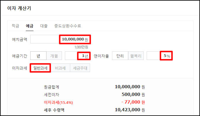 일반과세는 예금이자에 15.4%의 세금이 부과되는데요. 세금우대나 비과세 조건에 해당하지 않을 때 일반적으로 일반과세 상품이 됩니다. 위의 예시처럼 1천만원 1년 5%인 상품이 일반과세인 경우 세전이자는 50만원이지만 여기서 일반과세 15.4% 77,000원이 제외되면서 최종 받는 이자는 423,000원이 됩니다.