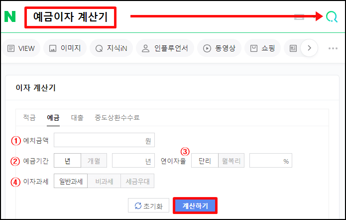 예금이자 계산기를 쉽게 찾을수 있는 곳은 네이버 사이트 입니다. 네이버 포털 검색창에 예금이자 계산기를 검색하면 이자계산기를 바로 만나 볼 수 있는데요. 해당 계산기로 적금, 예금, 대출, 중도상환수수료까지 쉽게 계산해 볼 수 있습니다.