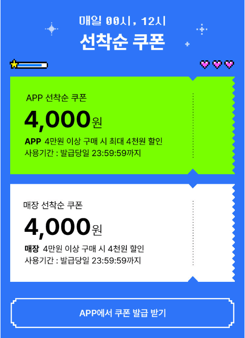 올리브영 6월 세일에서는 선착순 4천원 할인 쿠폰을 받을 수 있는데요. 매일 00시, 12시 진행되며 발급당일 23:59:59까지 사용이 가능합니다. 쿠폰은 앱용, 매장용으로 나누어 발급받을 수 있습니다. 쿠폰은 앱에서 발급이 가능합니다.