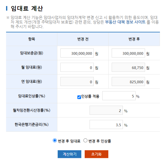 변경전 임대보증금에 3억원 입력, 변경후 임대보증금에 2억원을 입력 후 월차임전환시산정률은 고정되어 있으니, 한국은행기준금리를 조정해 해당 지역의 시장 전환율을 맞춘 후 계산하기를 클릭하면 해당 월세를 알 수 있습니다.