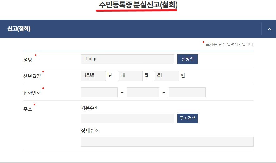 👉제일 상단의 주민등록증분실신고(철회)를 클릭합니다.