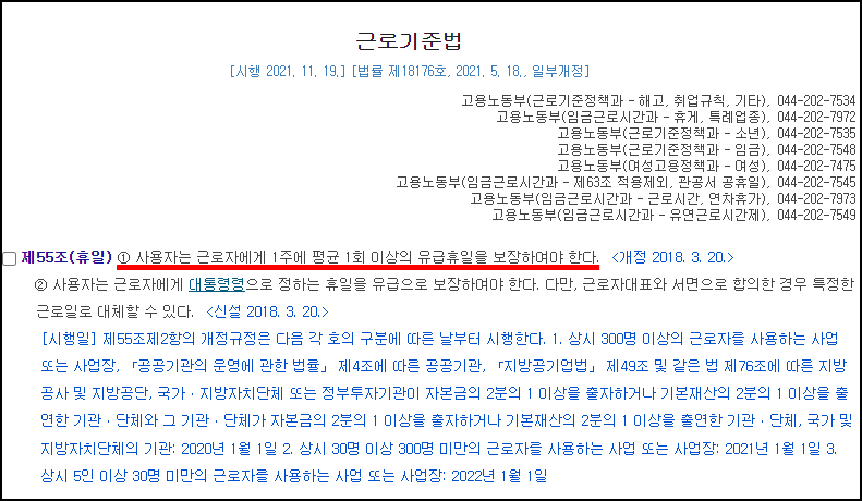 주휴수당은 근로기준법 제55조에 따라 사용자가 근로자에게 1주에 평균 1회 이상 유급휴일을 보장해야 한다는 것을 근거로 지급이 되고 있습니다.
