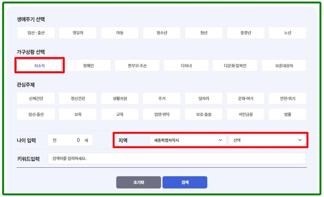 서비스목록 화면에서 가구상황을 저소득으로 선택한 후 지역은 본인이 거주하는 지역으로 설정합니다.