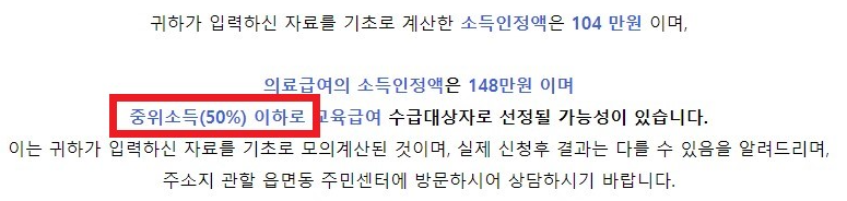 위의 산식에 따라 대상자 가구의 소득 및 재산을 계산했을 때 기준중위소득 50% 이하 금액이 나오면 차상위계층 선정조건을 충족하게 됩니다.