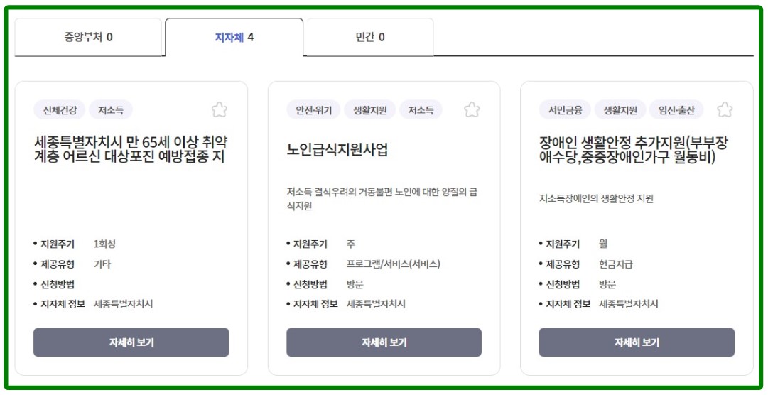 세종시를 기준으로 조회해 보니, 어르신 대상포진 예방접종, 노인급식지원, 장애인 생활안정 추가지원등의 복지서비스를 제공하고 있었습니다. 여러분들도 본인이 거주하는 지역으로 설정하여 조회해 보시기 바랍니다.