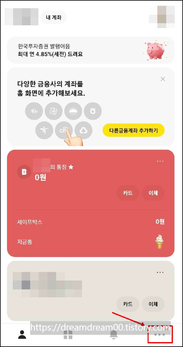 1. 카카오뱅크 메인화면에서 오른쪽 하단 점 3개를 클릭합니다.