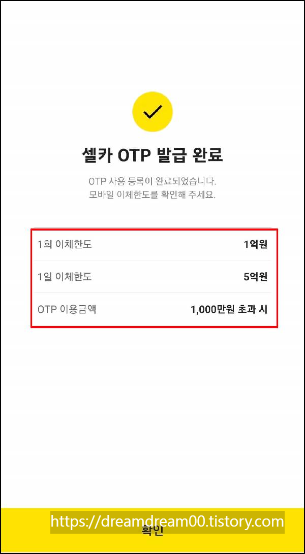 사업자등록증 인증을 마치셨다면 카카오뱅크 이체한도는 1일 5천만원, 1회 1천만 원입니다. 만약 이체한도를 더 늘리고 싶다면 방법이 있는데요. OTP를 활용해 이체한도를 높이는 것입니다.